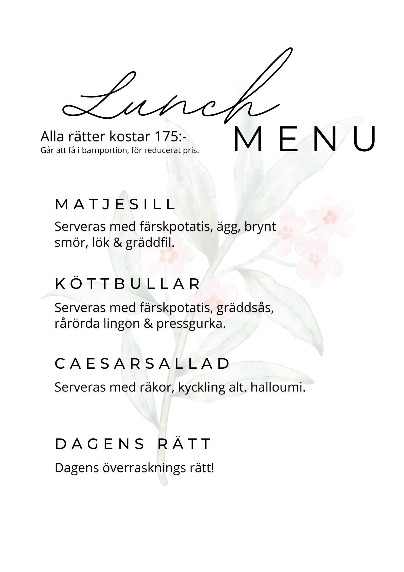 Vår meny är levande och ständigt föränderlig, inspirerad av årstidernas skiftningar och de råvaror som är i säsong, samt anpassad efter våra gästers efterfrågan och preferenser.